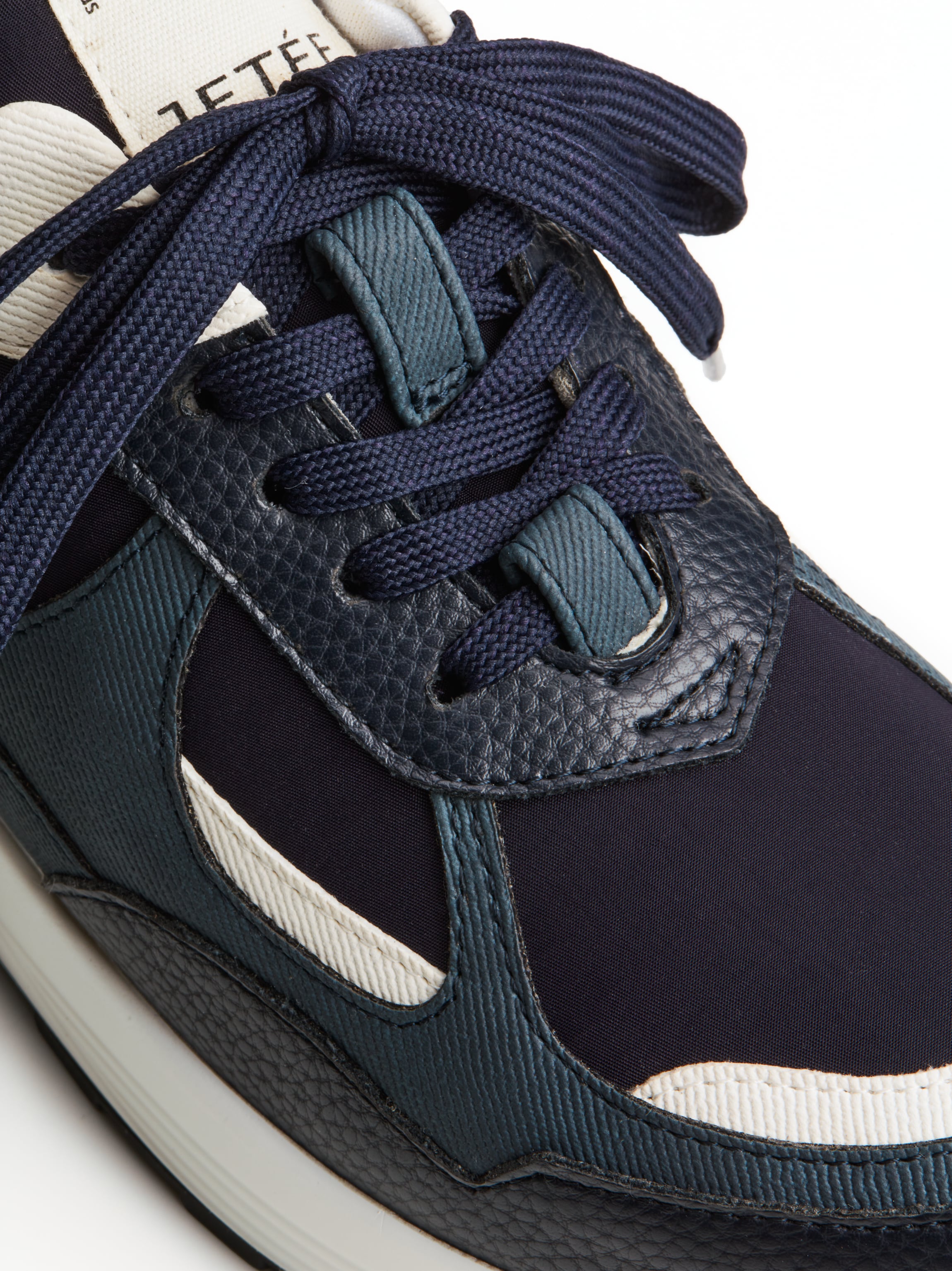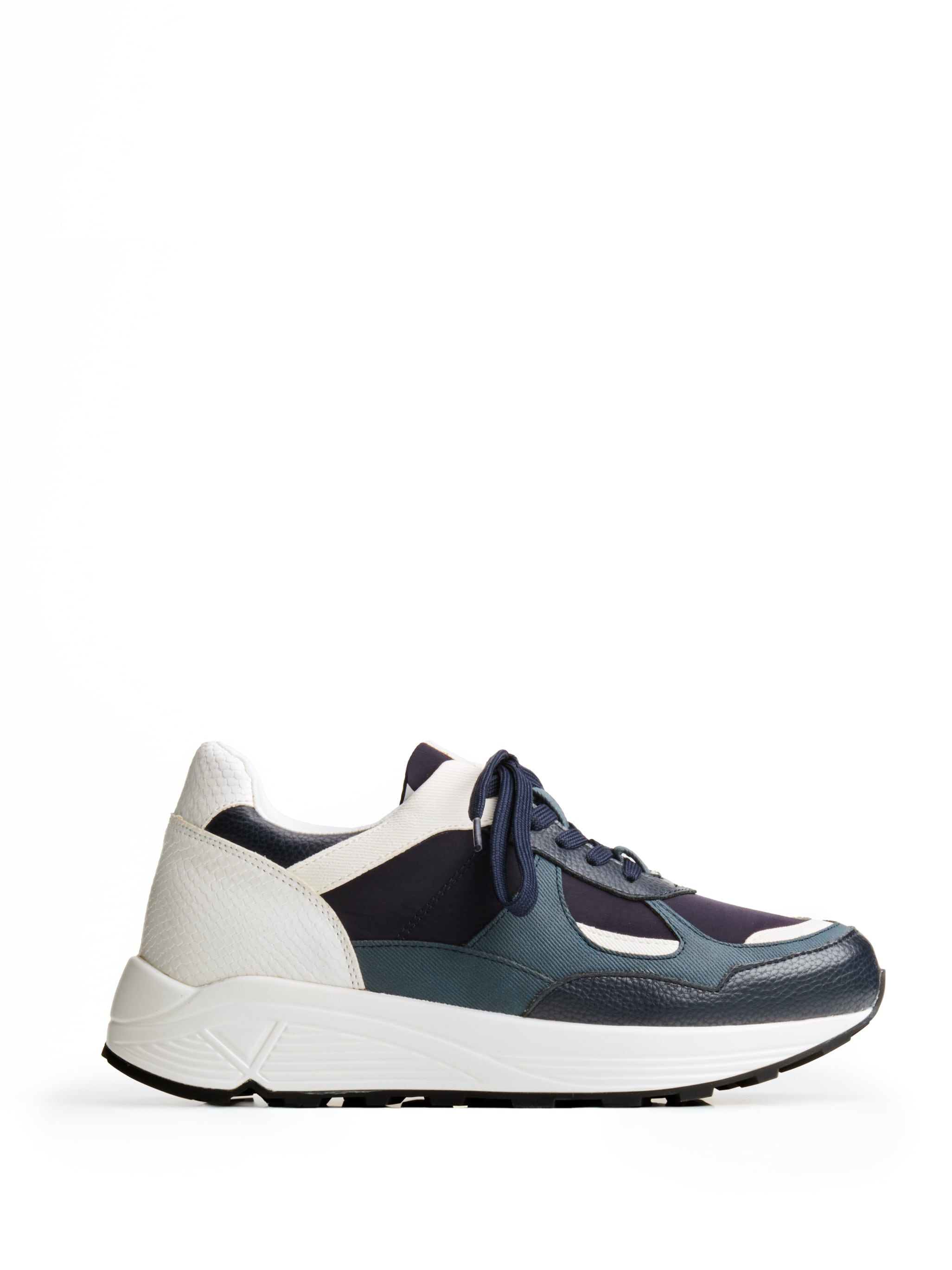 型押しやシュリンク風の合成皮革、光沢を抑えたポリエステル生地、スエード材や馬毛を使用し、スポーティーさとモードをMIX。計算された組み合わせが絶妙な1足です。
