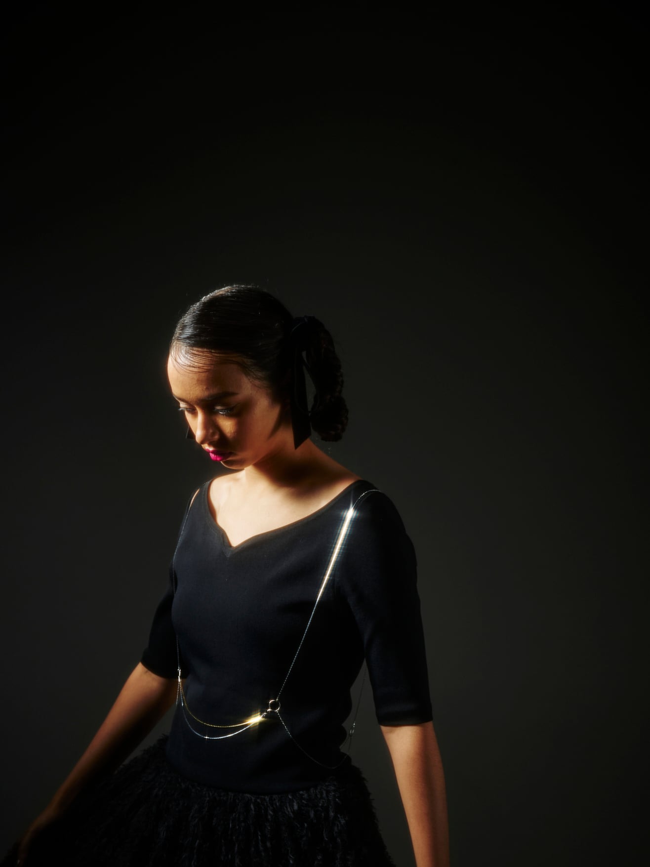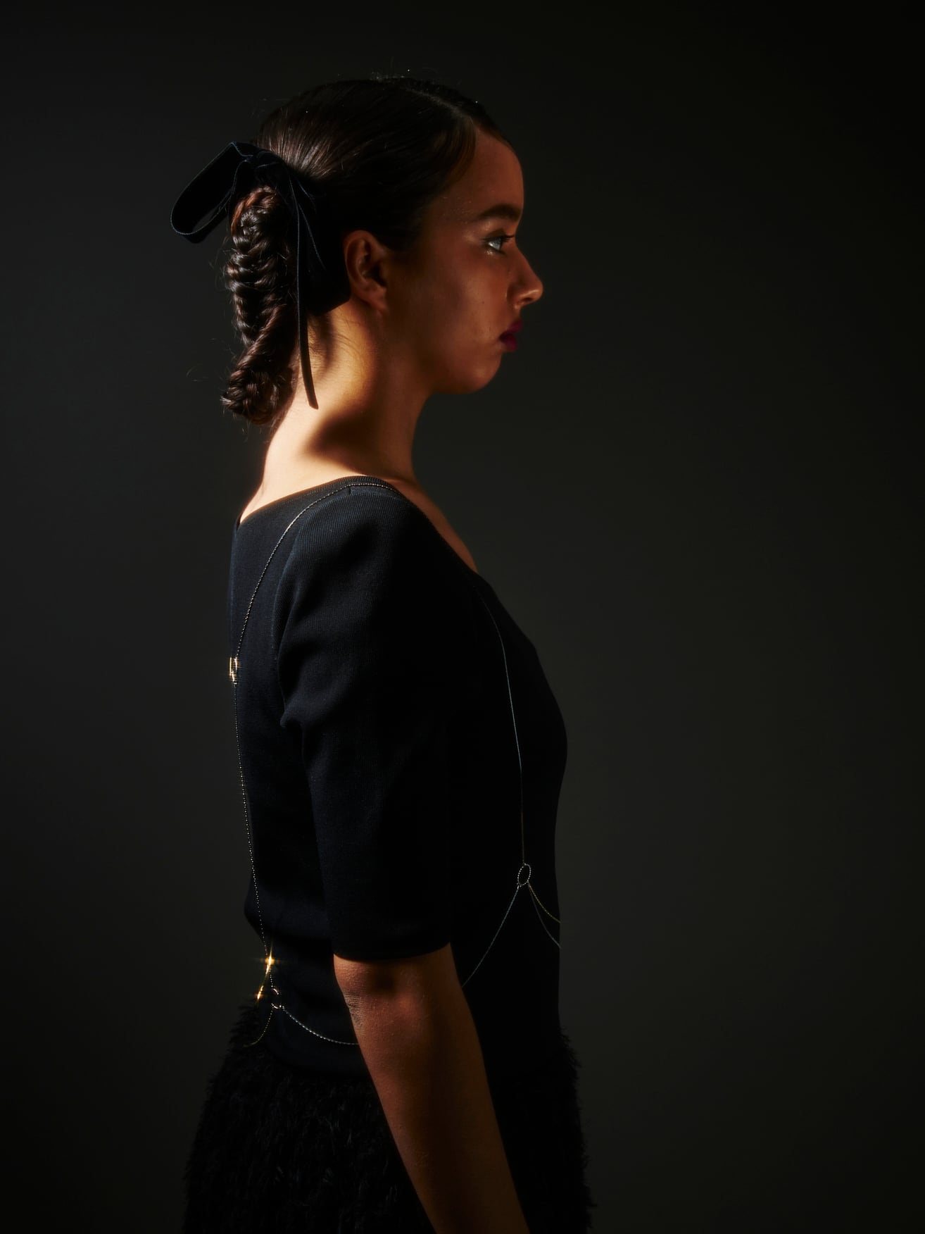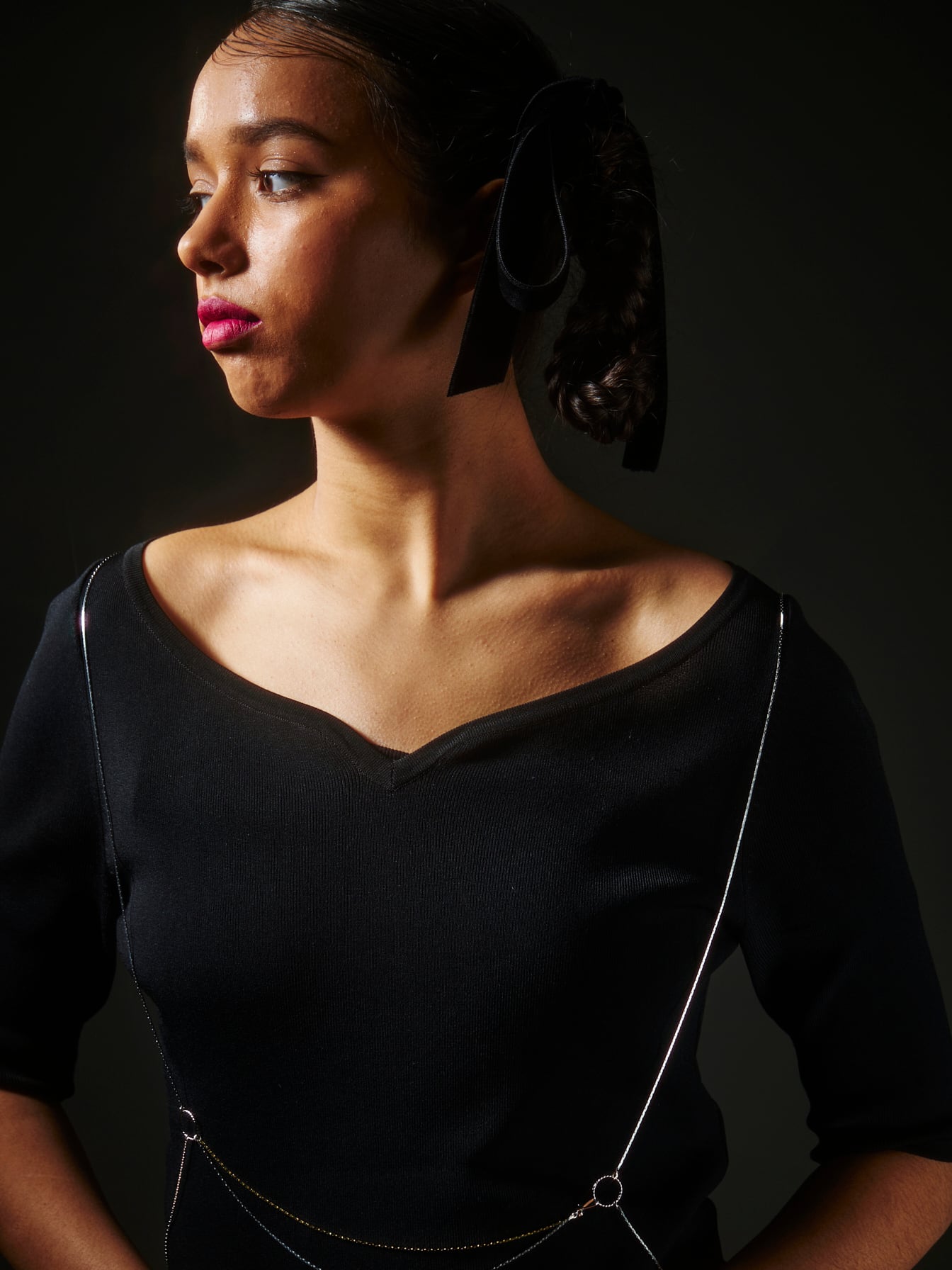 コーディネートのアクセントになる繊細なチェーンハーネス。