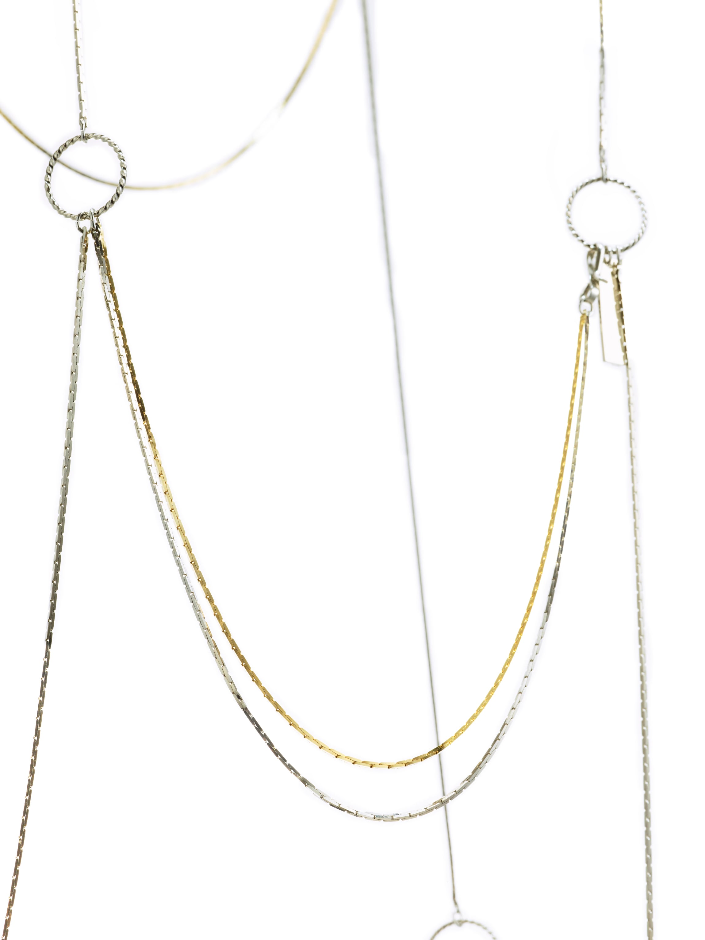 計算されたシルバーとゴールドのチェーンの組み合わせが、動いた時のきらめきがより印象深くなります。